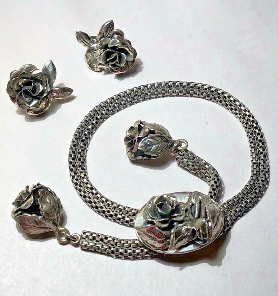 Vintage Danecraft Sterling Silver Slide Bracelet And Earrings Rose Lariat